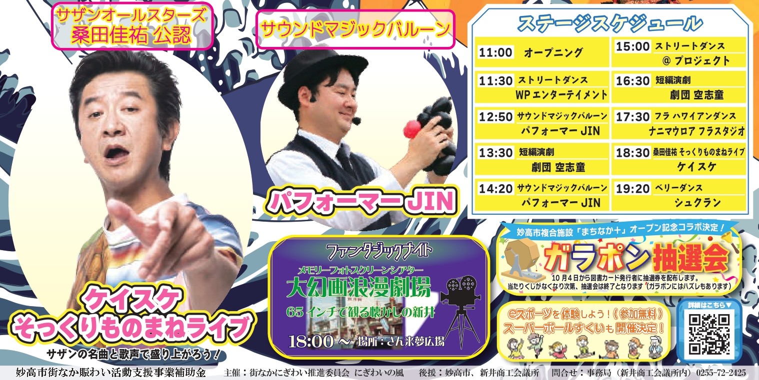 うまいもんまつりステージ出演者およびスケジュールについて イベント 2025.09.26 うまいもんまつりのステージイベントのタイムスケジュールが決定しました! なんといっても今回の目玉はサザンオールスターズ桑田佳祐さんご公認のそっくりタレント「ケイスケ」さんが出演!18:30からモノマネライブが行われますのでぜひお越しください。 そのほか、ちびっこに大人気のサウンドマジックパフォーマーJINや各種ダンスパフォーマンスが披露されます。